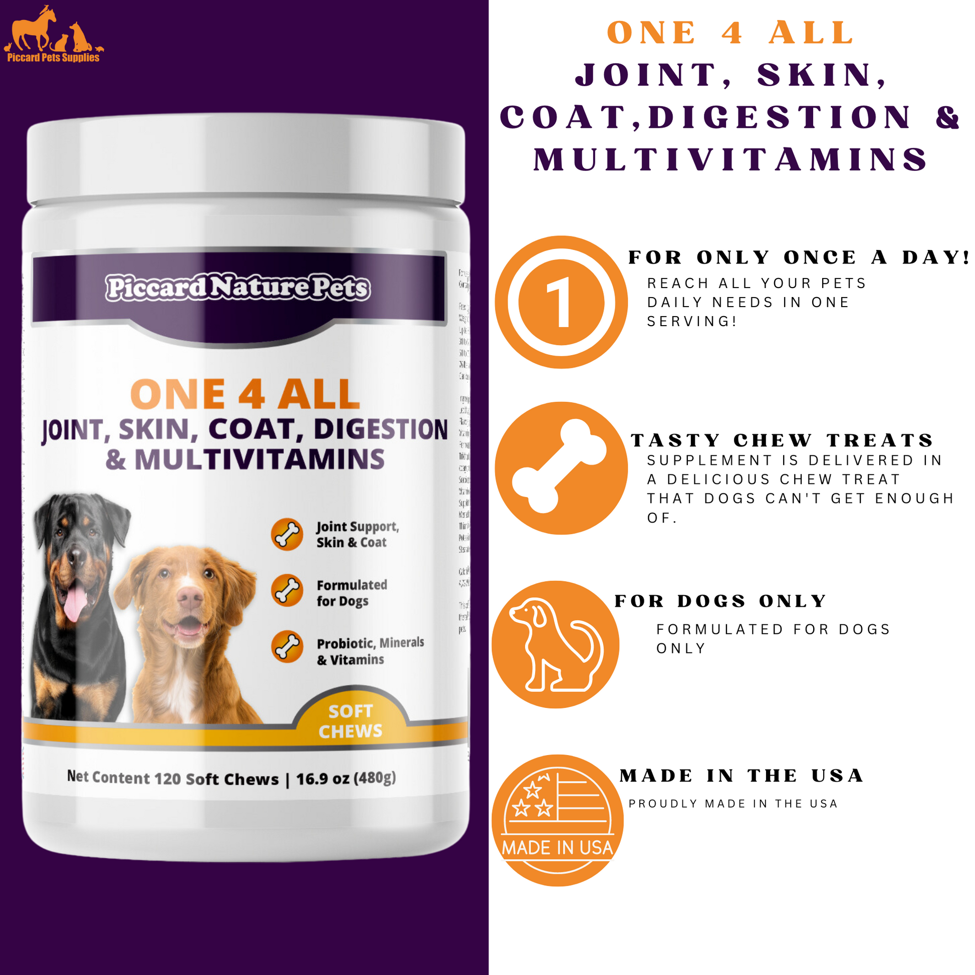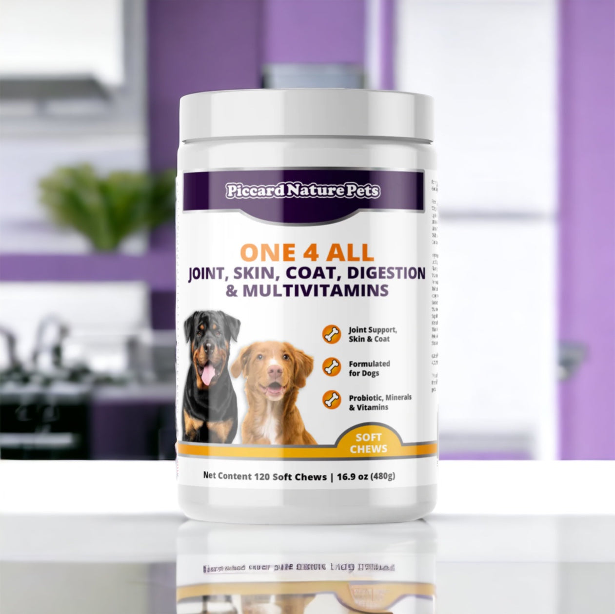 PiccardNaturePets One 4 All Joint, Skin & Coat, Digestion, and Multivitamins 120ct Soft Chews - Keep your dog healthy and pain-free with just one daily supplement!