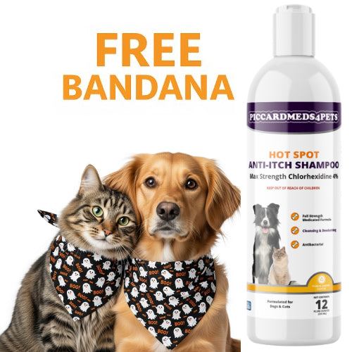 Support your pet's skin health with Piccardmeds4pets Hot Spot Anti-Itch Max Strength Shampoo. This veterinarian-formulated 4% chlorhexidine formula treats ringworm, hot spots, and itching while deodorizing and moisturizing, plus includes a FREE glow ghost bandana.