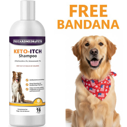 Combat common skin irritations with Piccardmeds4pets Keto-Itch Relief Medicated Shampoo. This veterinarian-formulated solution treats ringworm, hot spots, and itching with refreshing cucumber melon scent and oatmeal enrichment, plus includes a FREE patriotic bandana.
