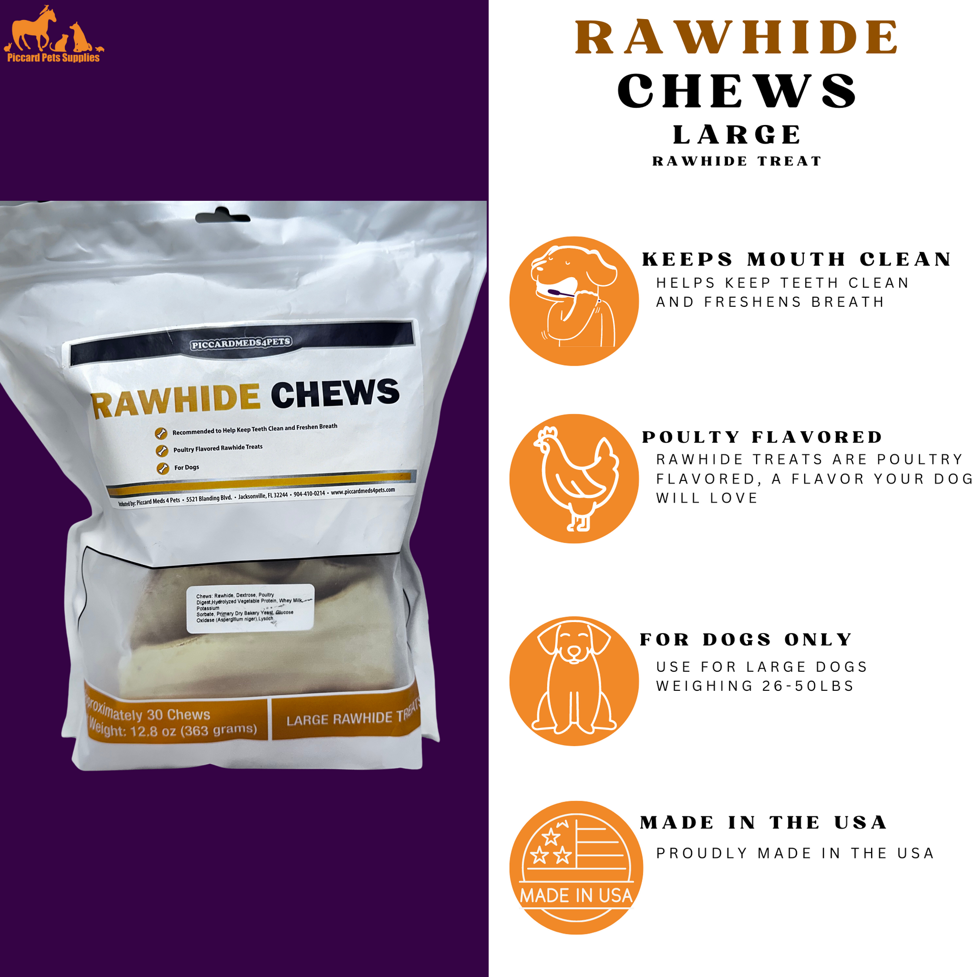 Piccardmeds4pets Rawhide Dental Chews for LG Dogs 26lbs-50lbs.